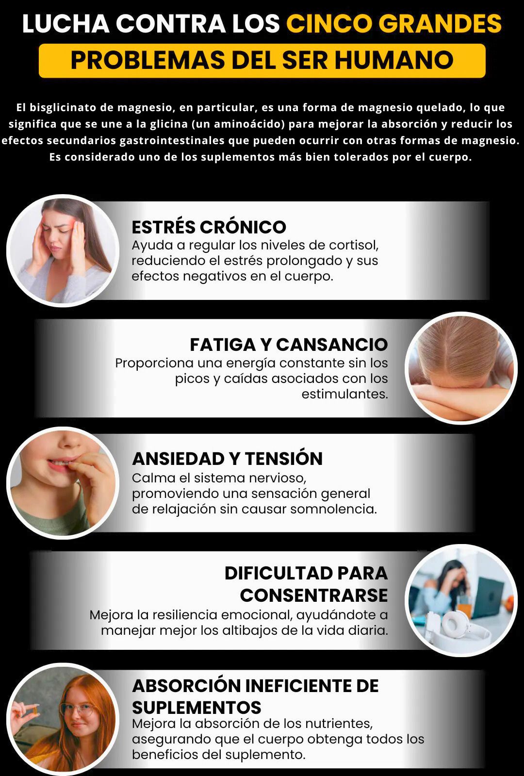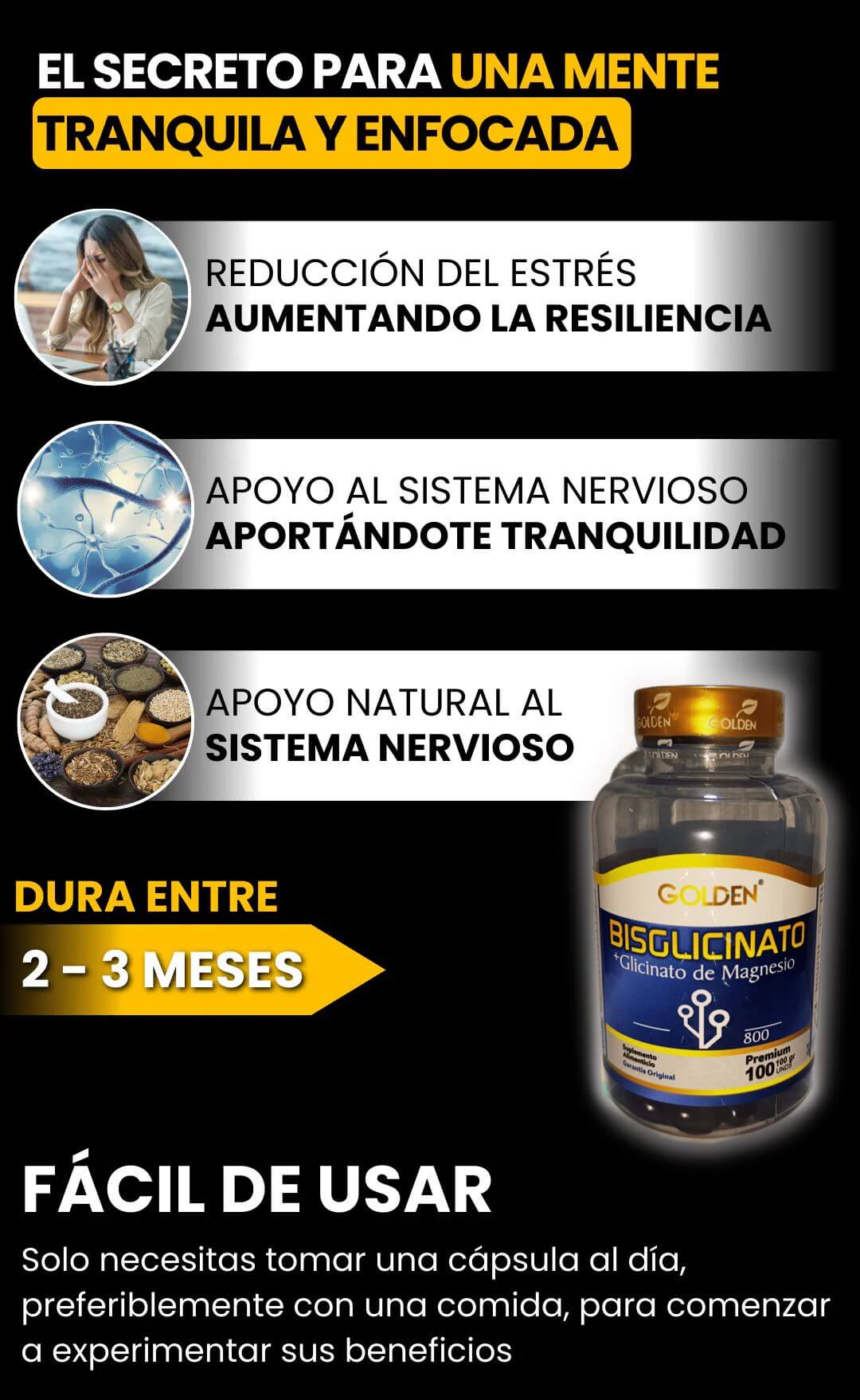 No dejes que el estrés controle tu vida. Nuestra fórmula natural de BISGLICINATO DE MAGNESIO te ayuda a mantener el equilibrio emocional y a enfrentar cada día con serenidad.